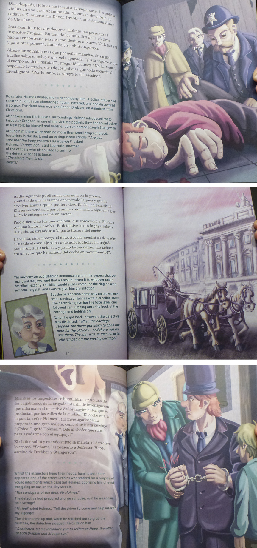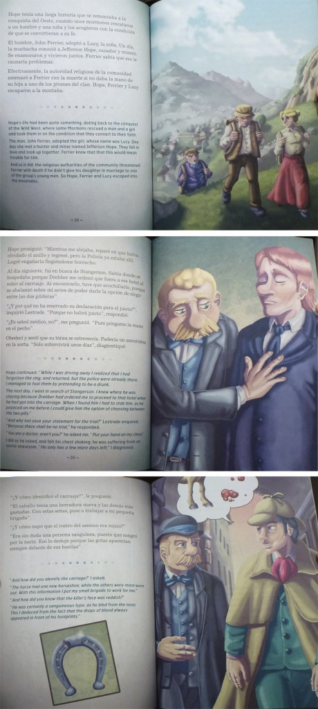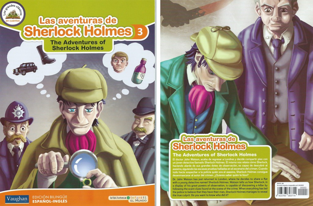 Hace aproximadamente un mes, salió con el MUNDO un libro inglés-castellano titulado “The adventures of Sherlock Holmes”. Es un resumen del primer libro de Conan Doyle adaptado a los niños. Tiene 21 ilustraciones a color mías, os adjunto algunas fotos.